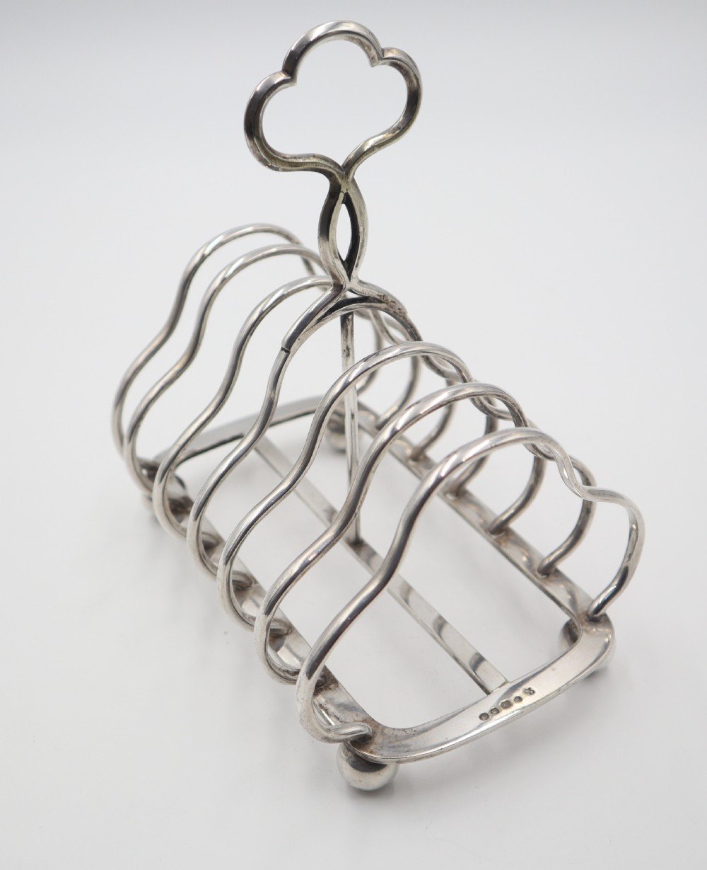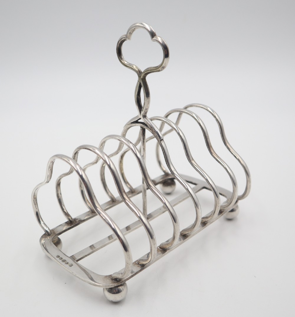 Good late Victorian silverplated 7-bar/6-division toast rack in faithful Regency style; of rectangular form resting on four ball feet. Sheffield. c.1880. Parkin & Marshall. Length 16cm Postage; by Royal Mail Special Delivery free of charge for deliveries within UK; outside UK deliveries by quotation. Payment; by using the payment button on this item's description, or bank transfer, please contact us for our bank details. All items are professionally packed prior to posting. Please do not hesitate to contact us for any information regarding any of our stock items, we try to make our descriptions as informative as possible, but are always delighted to be of any further assistance. Internal Ref: 28/2266