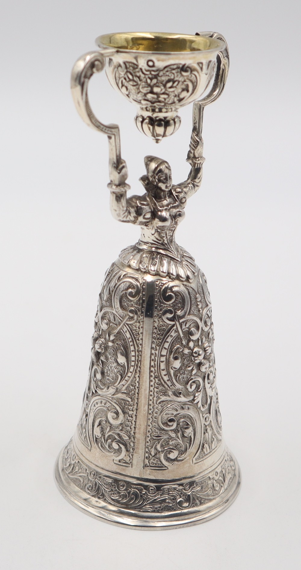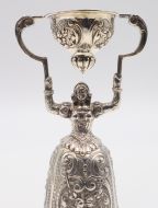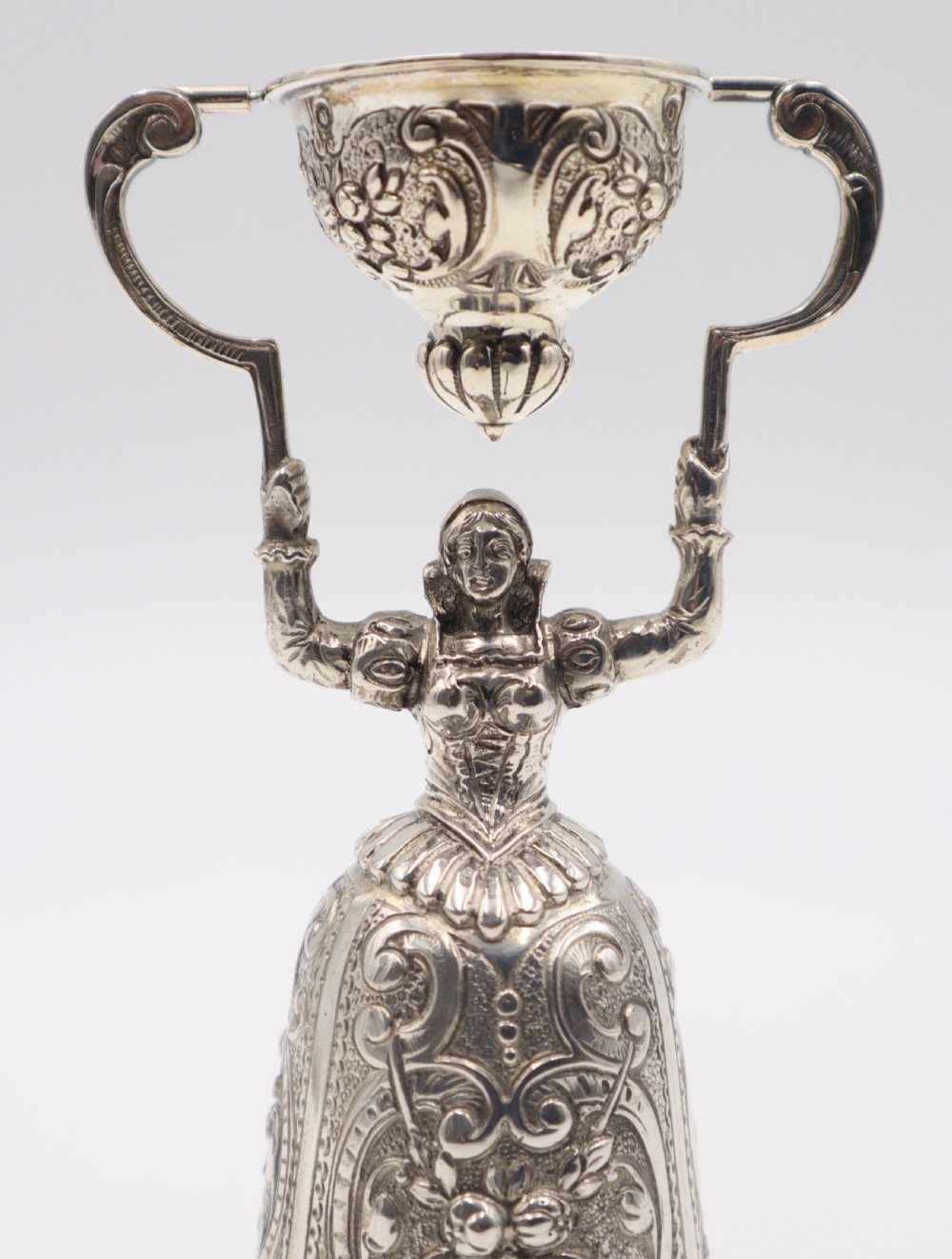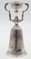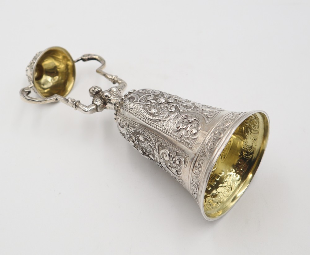 Late 19th century German silver wager/marriage cup, in traditional style; lovely quality decoration with perfect lemon gilding to the interior, and the pivot to the upper cup is perfect. As crisp as the day it was made. Hanau. c.1890. probably Storck & Sinsheimer. Height 15cm Weight 4.5 troy oz/140gm Postage; by Royal Mail Special Delivery free of charge for deliveries within UK; outside UK deliveries by quotation. Payment; by using the payment button on this item's description, or bank transfer, please contact us for our bank details. All items are professionally packed prior to posting. Please do not hesitate to contact us for any information regarding any of our stock items, we try to make our descriptions as informative as possible, but are always delighted to be of any further assistance. Internal Ref: 28/2270