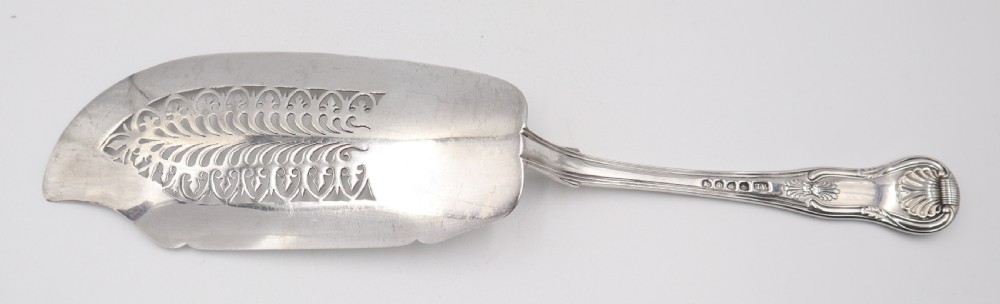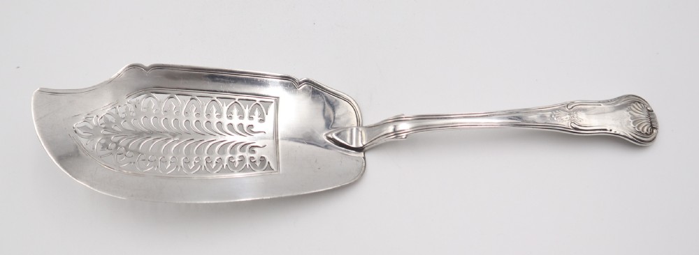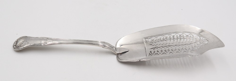 Good size Geo. IV silver fish slice in Hourglass pattern; traditional design with good, pretty pierced pattern to the blade. London. 1820. Maker's mark A.L (not listed.) Length 28cm Weight 4 troy oz/125gm Postage; by Royal Mail Special Delivery free of charge for deliveries within UK; outside UK deliveries by quotation. Payment; by using the payment button on this item's description, or bank transfer, please contact us for our bank details. All items are professionally packed prior to posting. Please do not hesitate to contact us for any information regarding any of our stock items, we try to make our descriptions as informative as possible, but are always delighted to be of any further assistance. Internal Ref: 28/2285