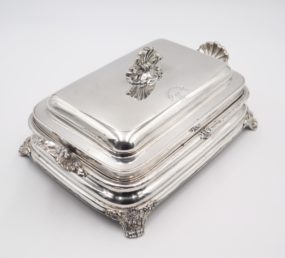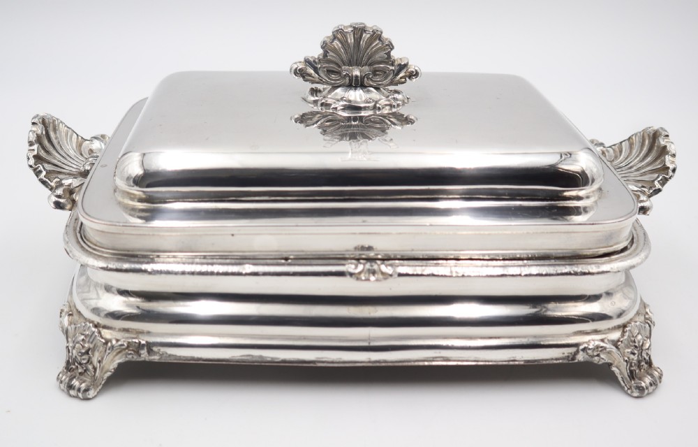 Very good Geo.IV Old Sheffield Plate warming dish; of plain rectangular form with shell pattern feet and handles. The base is has a plug at the side which can be filled with boiling water, to provide heat to warm the food on the removeable middle section, the top cover also helps keeps the food warm,. These pieces are also known as bacon or cheese dishes as these types of "flat" food are best suited to the space provided; eggs, asparagus etc. are also well suited. Really good example, bearing a fine crest English. c.1825. Length 31cm Postage; by Royal Mail Special Delivery free of charge for deliveries within UK; outside UK deliveries by quotation. Payment; by using the payment button on this item's description, or bank transfer, please contact us for our bank details. All items are professionally packed prior to posting. Please do not hesitate to contact us for any information regarding any of our stock items, we try to make our descriptions as informative as possible, but are always delighted to be of any further assistance. Internal Ref: 28/2221