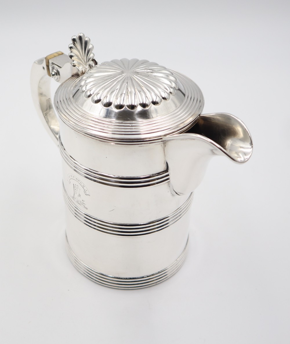 Great quality Early Victorian silver, lidded beer or cider jug; in Geo,III manner, of plain straight-sided cylindrical form with banded decoration to the body. The hinged lid is slightly domed with fluted decoration to the top and a fine shell thumbpiece. This piece bears a crest and is of good size and weight ; it is hallmarked on both the body and the lid. Lovely piece, and really quite rare. Edinburgh. 1856. James & Walter Marshall. Height 18.5cm Weight 24 troy oz/746gm Postage; by Royal Mail Special Delivery free of charge for deliveries within UK; outside UK deliveries by quotation. Payment; by using the payment button on this item's description, or bank transfer, please contact us for our bank details. All items are professionally packed prior to posting. Please do not hesitate to contact us for any information regarding any of our stock items, we try to make our descriptions as informative as possible, but are always delighted to be of any further assistance. Internal Ref: 28/2227