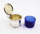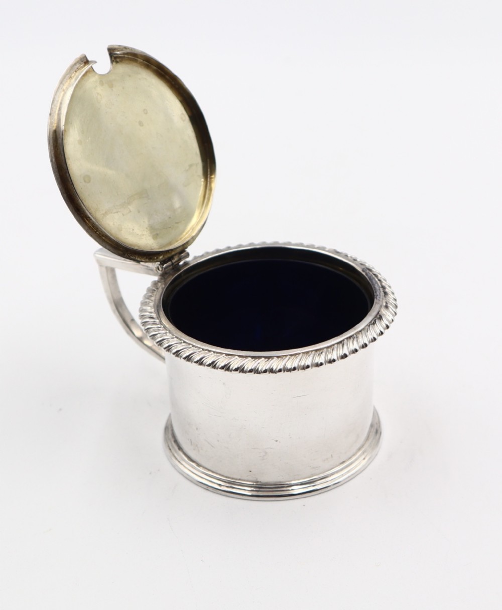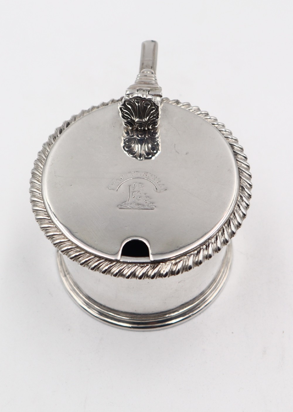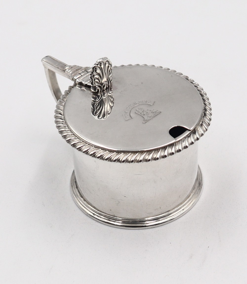 Handsome, Scottish, Geo.IV silver mustard pot; of circular "drum" shape with a plain body and a fine thick gadroon border. The hinged lid has a lovely "shell" thumbpiece and bears a crest. The interior is gilded and also contains a blue glass liner. This is a good size example, of well-above average weight and displays all the pointers of a high quality piece, good hinge, entirely solid silver base, and nice substantial border and thumbpiece. Edinburgh. 1836. Elder & Co. Height 7cm Weight (excluding liner) 6 Troy oz/187gm Postage; by Royal Mail Special Delivery free of charge for deliveries within UK; outside UK deliveries by quotation. Payment; by using the payment button on this item's description, or bank transfer, please contact us for our bank details. All items are professionally packed prior to posting. Please do not hesitate to contact us for any information regarding any of our stock items, we try to make our descriptions as informative as possible, but are always delighted to be of any further assistance. Internal Ref: 28/2238