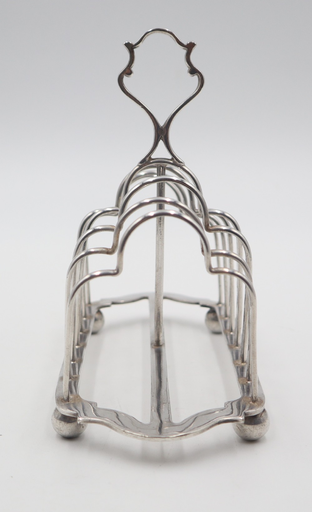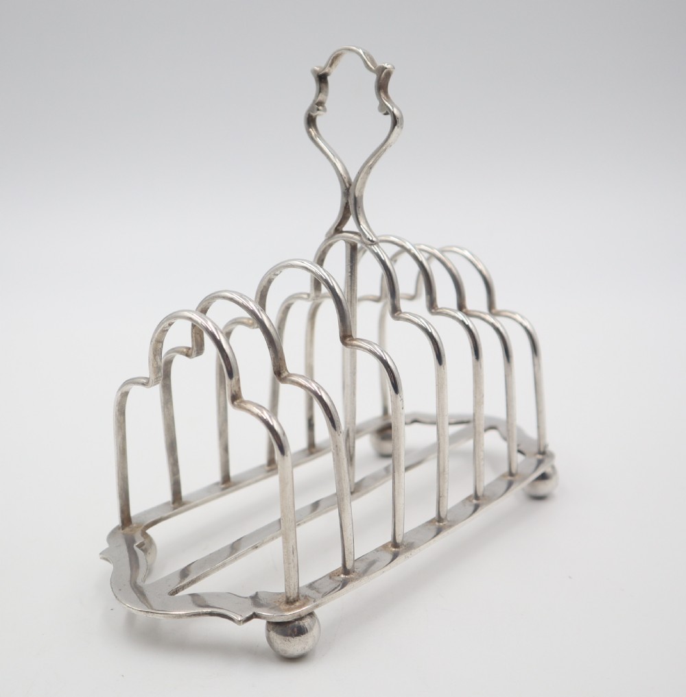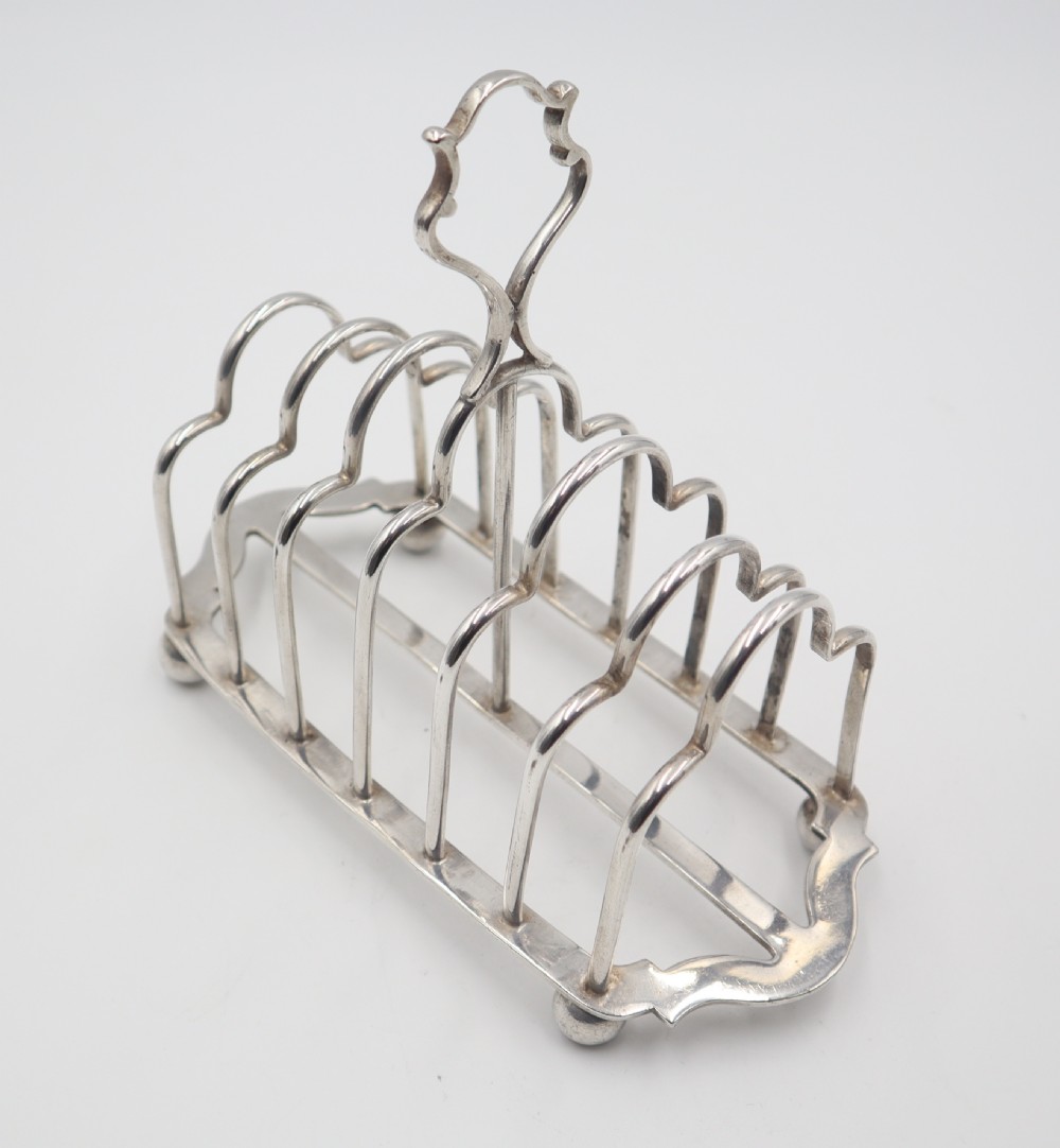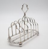 Handsome, late Victorian, silverplated 7-bar/6-division toast rack; of rectangular form, standing on four ball feet. Really good quality and nicely marked. Sheffield. c.1890. George Waterhouse & Co. Length 17.5cm Postage; by Royal Mail Special Delivery free of charge for deliveries within UK; outside UK deliveries by quotation. Payment; by using the payment button on this item's description, or bank transfer, please contact us for our bank details. All items are professionally packed prior to posting. Please do not hesitate to contact us for any information regarding any of our stock items, we try to make our descriptions as informative as possible, but are always delighted to be of any further assistance. Internal Ref: 28/2265