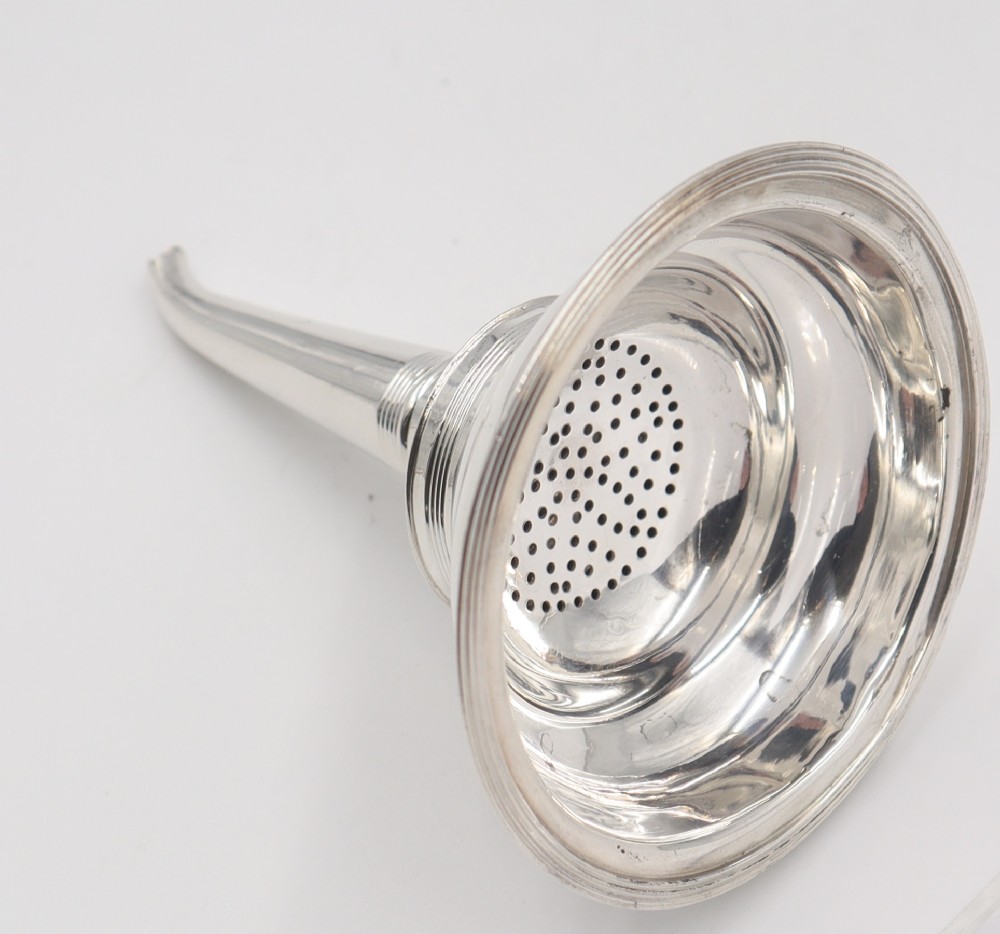 Good Geo.III silver wine funnel; of typical plain design of the period with reeded pattern decoration to the borders, detachable strainer, and in great condition. London. 1807. Edward Mayfield. Height 13.5cm Weight 3 troy oz/93gm Postage; by Royal Mail Special Delivery free of charge for deliveries within UK; outside UK deliveries by quotation. Payment; by using the payment button on this item's description, or bank transfer, please contact us for our bank details. All items are professionally packed prior to posting. Please do not hesitate to contact us for any information regarding any of our stock items, we try to make our descriptions as informative as possible, but are always delighted to be of any further assistance. Internal Ref: 28/2267