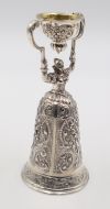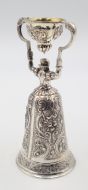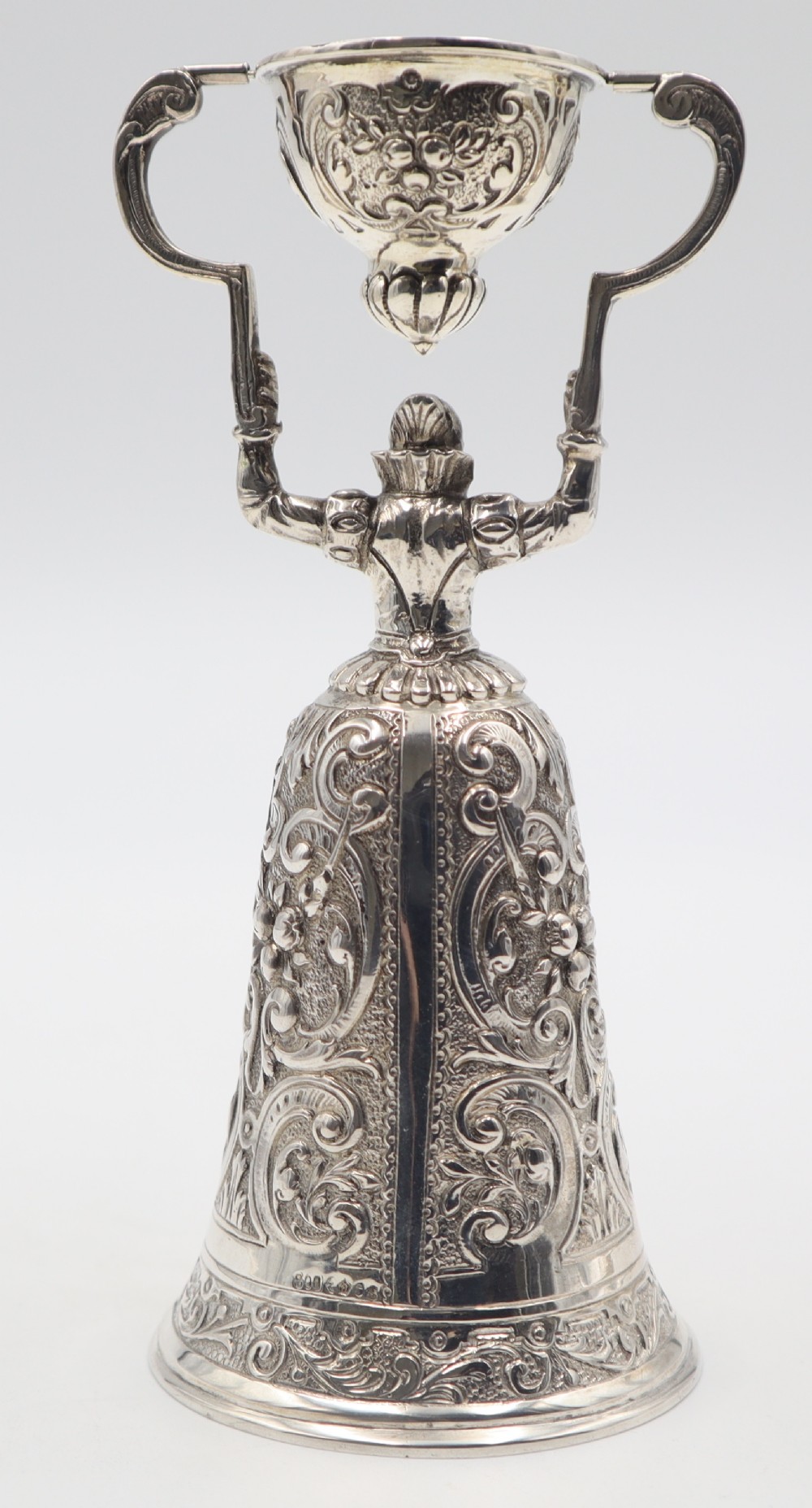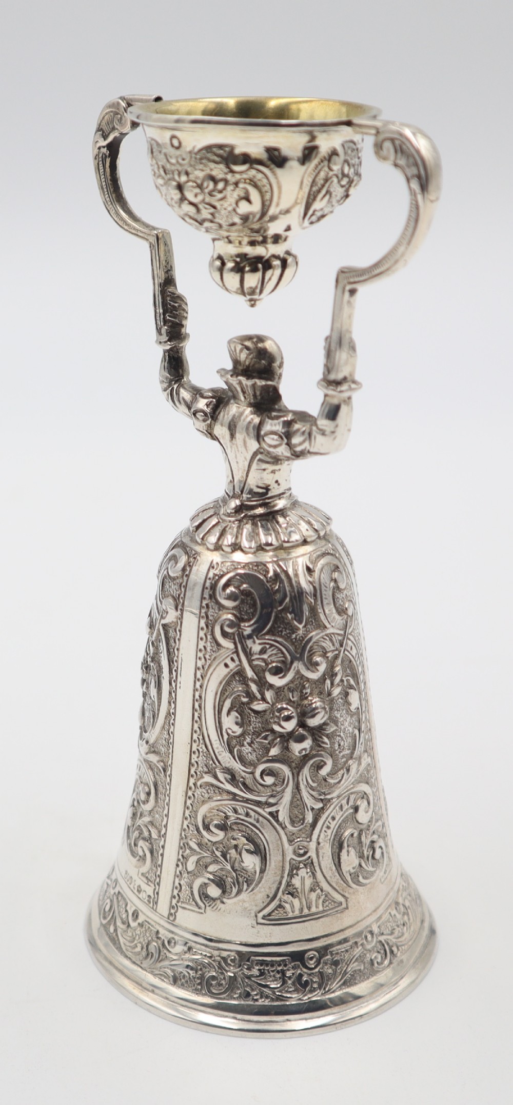 Late 19th century German silver wager/marriage cup, in traditional style; lovely quality decoration with perfect lemon gilding to the interior, and the pivot to the upper cup is perfect. As crisp as the day it was made.