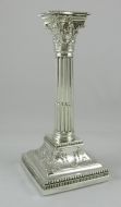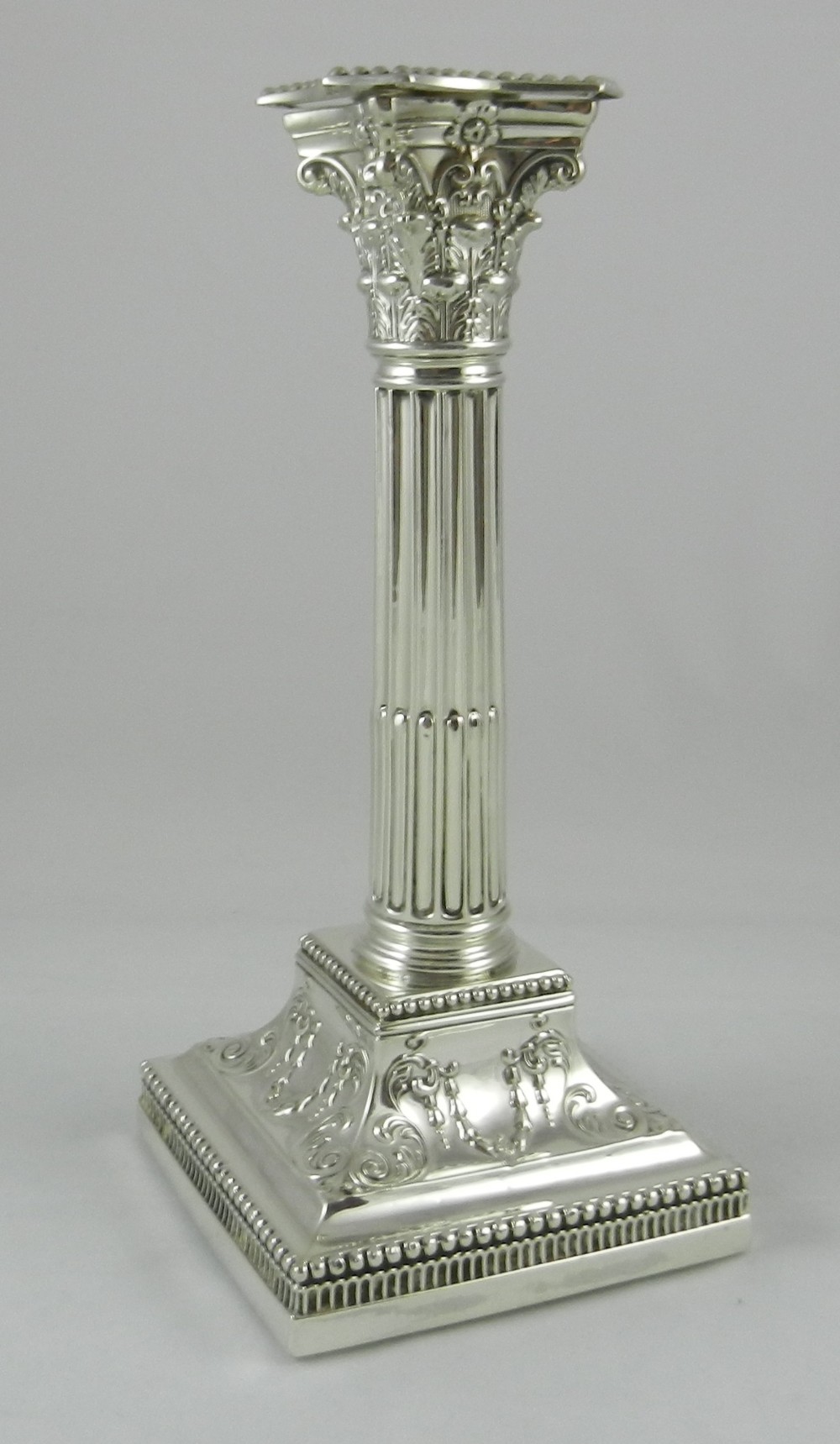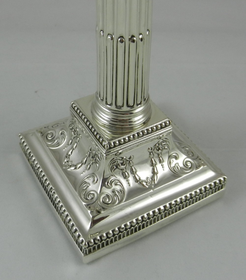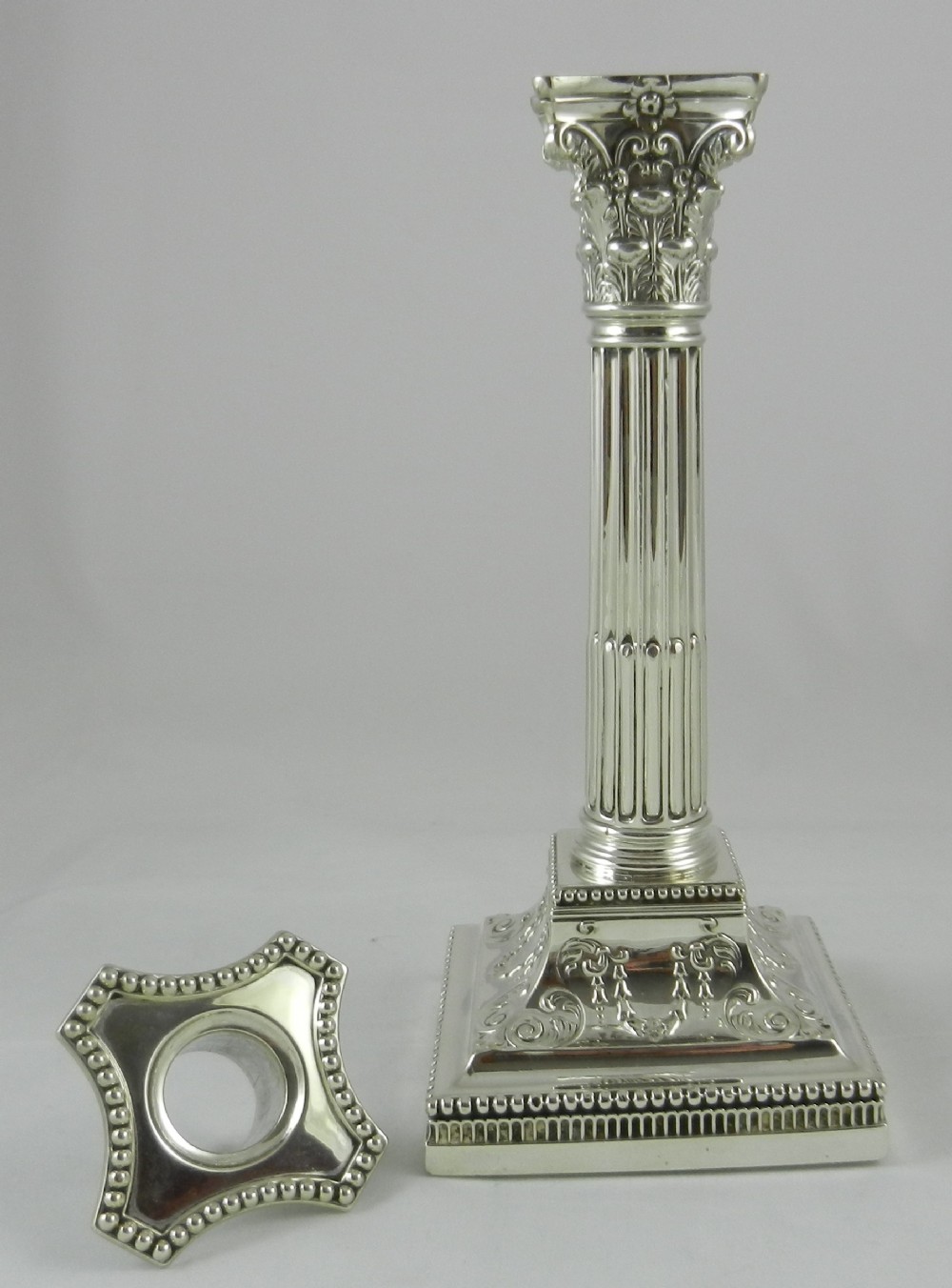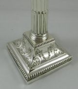 Pair Victorian silver candlesticks; of Corinthian column design, with typical square bases, beaded borders, scroll and harebell decoration also to the bases. The columns are of fluted style with glorious foliate and acanthus leaf capitols. The detachable sconces are of beaded border design. Great maker of the period and excellent quality.