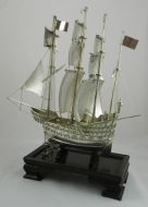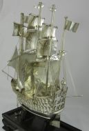 English silver scale-model of a 16th century galleon (or neff.) This wonderfully executed piece is unusually made in England, rather than manufactured in Europe and then imported into England. This is a four-masted vessel, fully rigged, bristling with anchors and gun ports; the whole resting on a carved wooden stand. The craftsmanship is superb, even down to the fully articulated rudder and finely engraved lantern at the rear. Most individual/moveable pieces are hallmarked. Great size and very impressive; a really magnificent display!