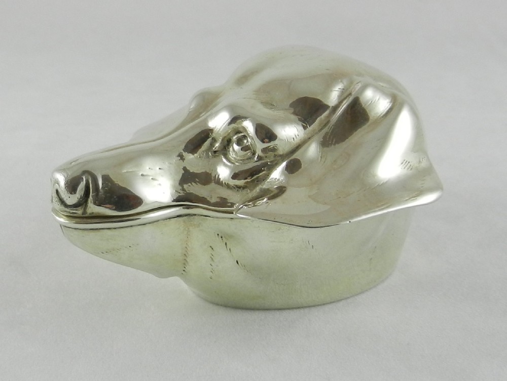 19th century silver table/trinket box in the form of a dachshund's head. This fine box is of good, impressive size, finely modelled by one of Hanau's great silversmiths. The detail and modelling are of the highest quality and the interior is finely gilt-washed. A very unusual, charming piece; first class!