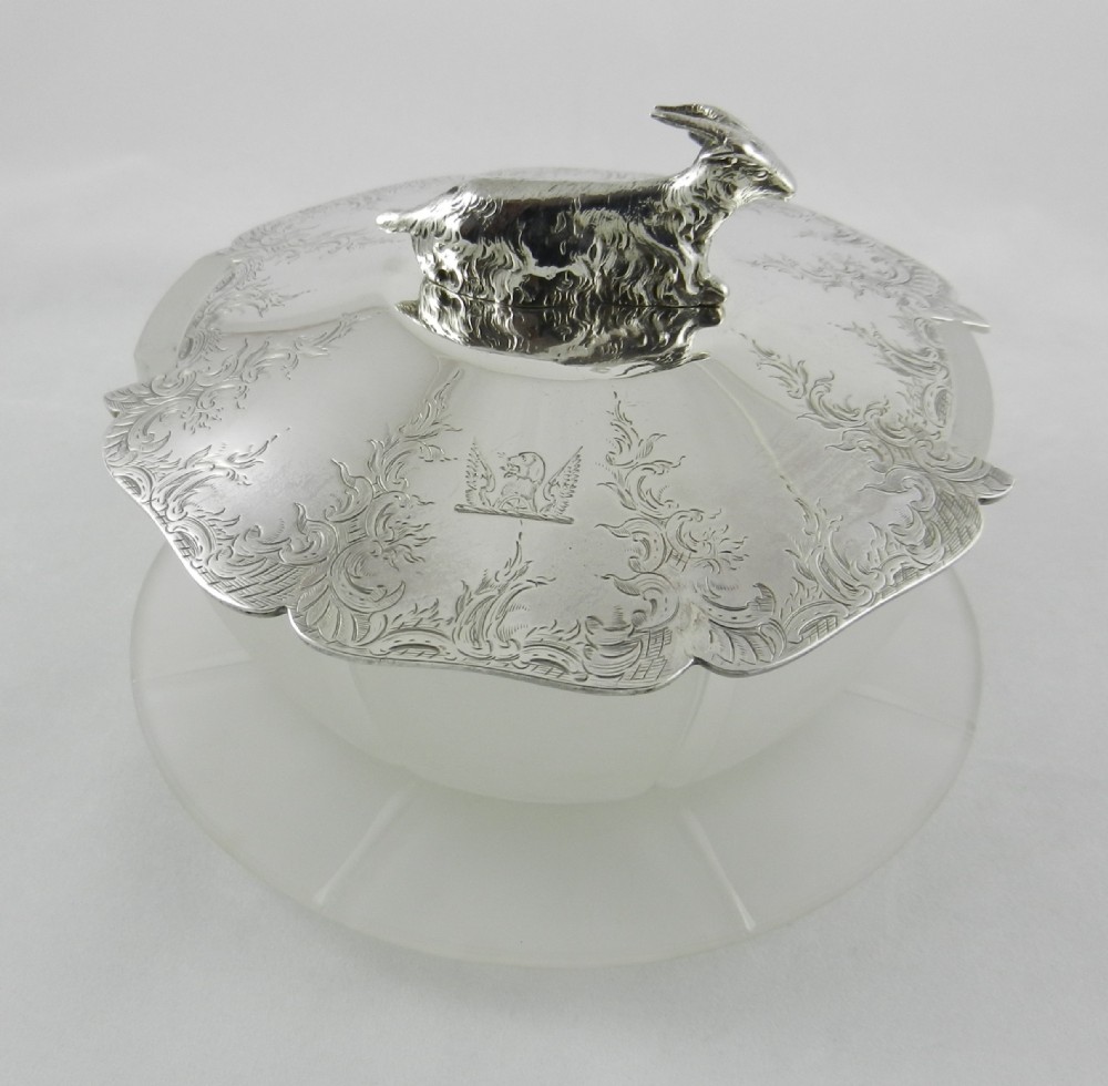 Early Victorian, silver lidded, frosted glass butter dish. The plate and dish are of frosted glass, and the lid/cover is silver, with a goat finial; the cover is beautifully decorated with floral scrolls and a wonderful model of the goat as a lifting piece. There is a crest to the cover, and both the cover and goat are clearly hallmarked with matching marks. Top condition, charming piece, typical of the period. London.1857.Charles & George Fox. Width of lid 14.5cm. Width of base plate 16cm. Height 11cm. Postage; by Royal Mail Special Delivery free of charge for deliveries within UK; outside UK deliveries by quotation. Payment; by using the payment button on this item's description, or bank transfer, please contact us for our bank details. All items are professionally packed prior to posting. Please do not hesitate to contact us for any information regarding any of our stock items, we try to make our descriptions as informative as possible, but are always delighted to be of any further assistance. Internal Ref: 28/1398