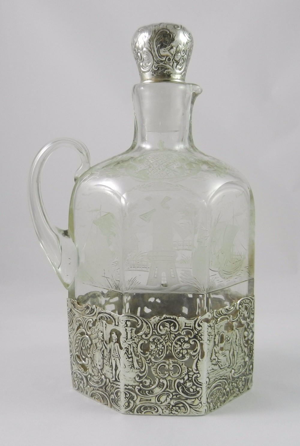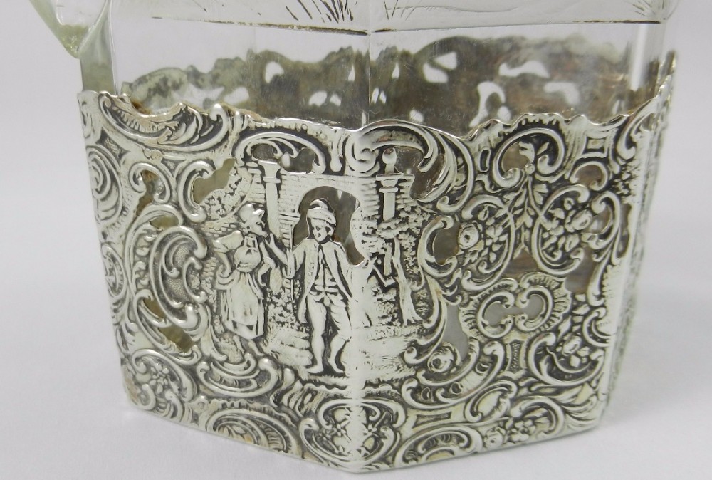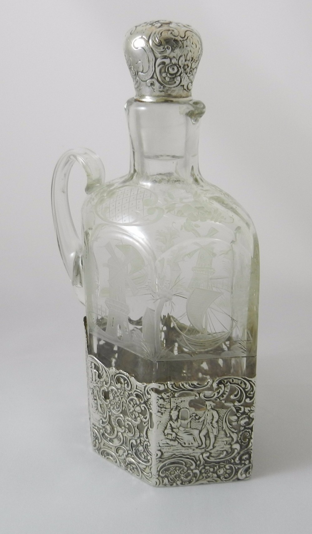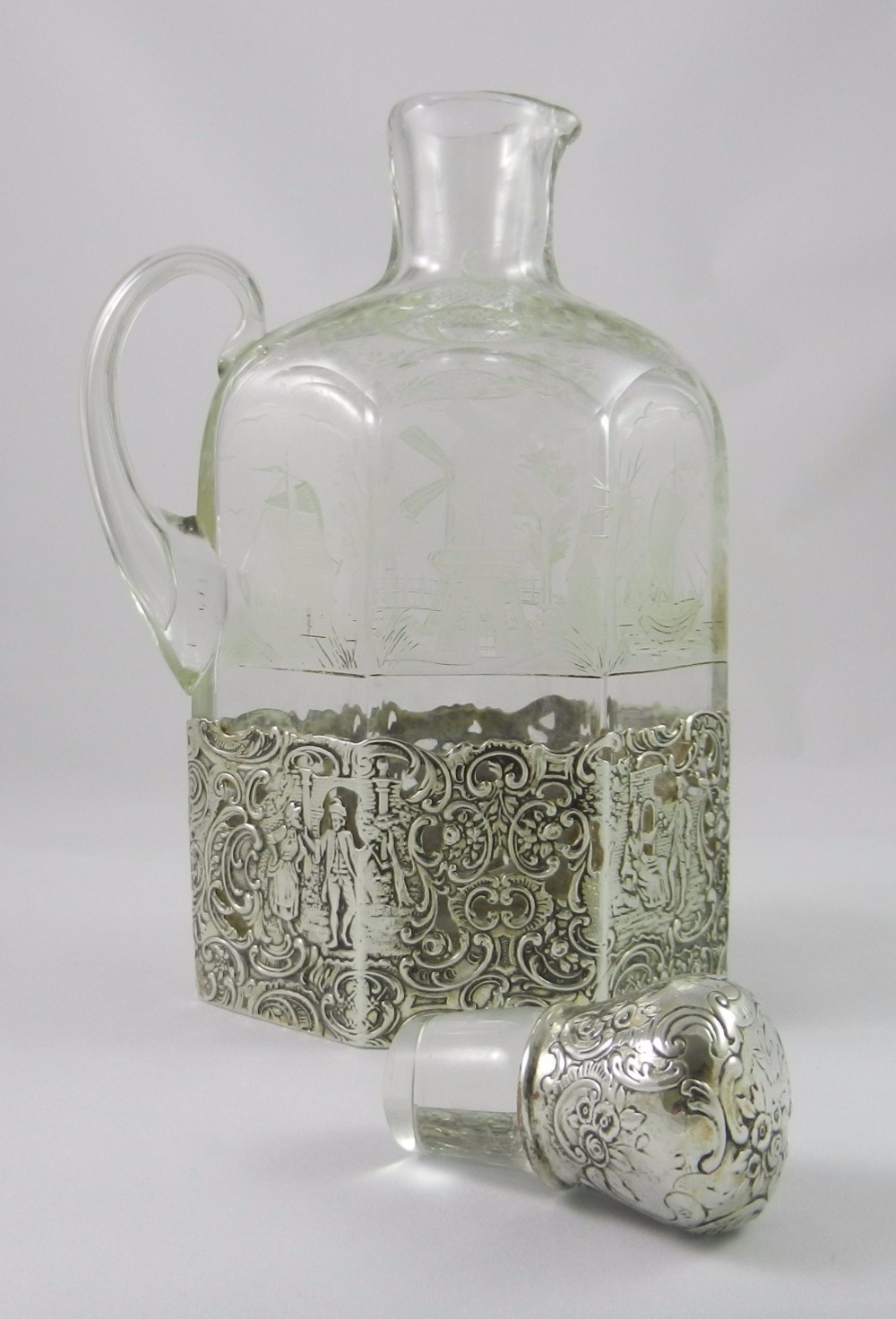 19th century silver-mounted, etched glass wine/liqueur/gin jug. In the Dutch style, this piece was made in Germany and has the most wonderful Dutch scenes etched in to the glass, the silver mounting is a riot of typical rural scenes of couples surrounded by foliate design. The glass stopper is similarly silver mounted. Just perfect! German (Hanau) c.1890, Wolf & Knell. Height 24.5cm Postage; by Royal Mail Special Delivery free of charge for deliveries within UK; outside UK deliveries by quotation. Payment; by using the payment button on this item's description, or bank transfer, please contact us for our bank details. All items are professionally packed prior to posting. Please do not hesitate to contact us for any information regarding any of our stock items, we try to make our descriptions as informative as possible, but are always delighted to be of any further assistance. Internal Ref: 28/1490