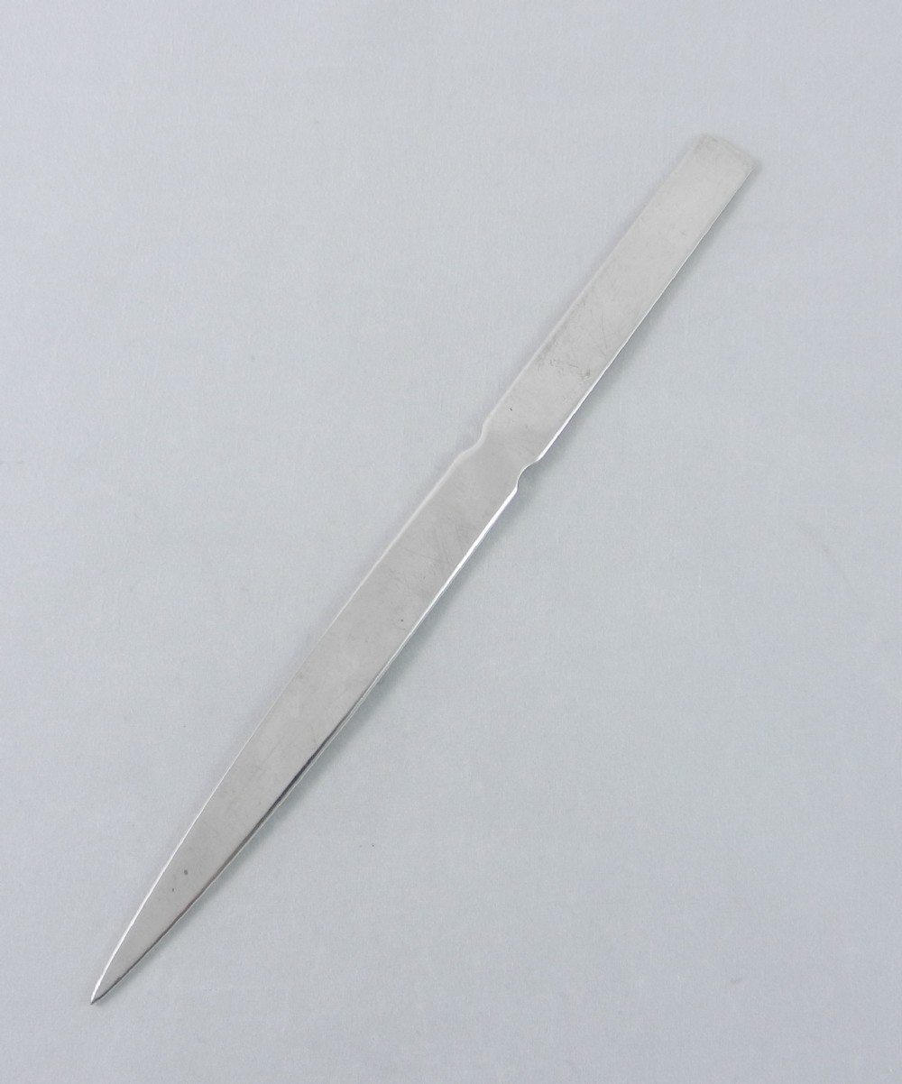 Silver paper knife/letter opener, with a crest to the top of the handle. Great addition to any desk.