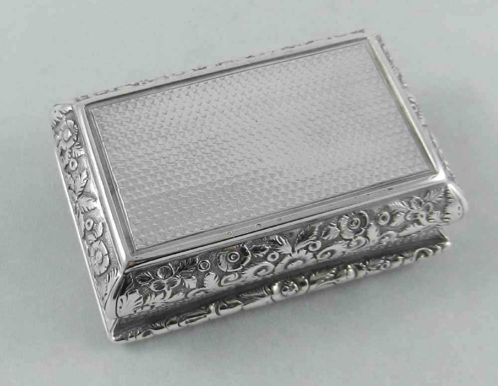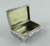 William IV silver snuff box; of rectangular form with engine-turned base, foliate decoration to the sides and outer rim of the lid. The foreground of the lid has the name of the user/owner engraved. The interior has original gilding and is well and clearly marked. Best box maker of the period, good size and quality. Birmingham. 1836. Nathaniel Mills. Length 7.5cm Postage; by Royal Mail Special Delivery free of charge for deliveries within UK; outside UK deliveries by quotation. Payment; by using the payment button on this item's description, or bank transfer, please contact us for our bank details. All items are professionally packed prior to posting. Please do not hesitate to contact us for any information regarding any of our stock items, we try to make our descriptions as informative as possible, but are always delighted to be of any further assistance. Internal Ref: 28/1889