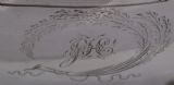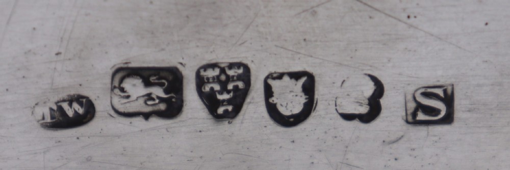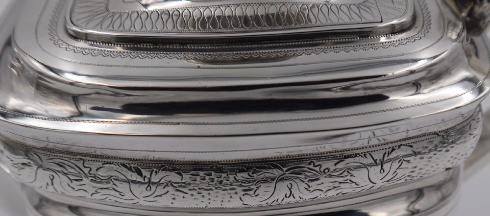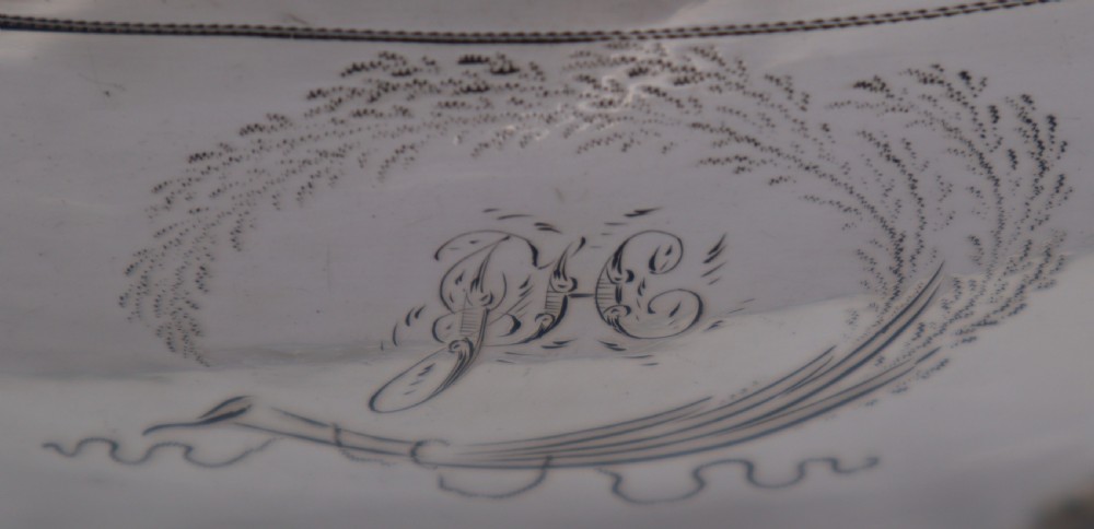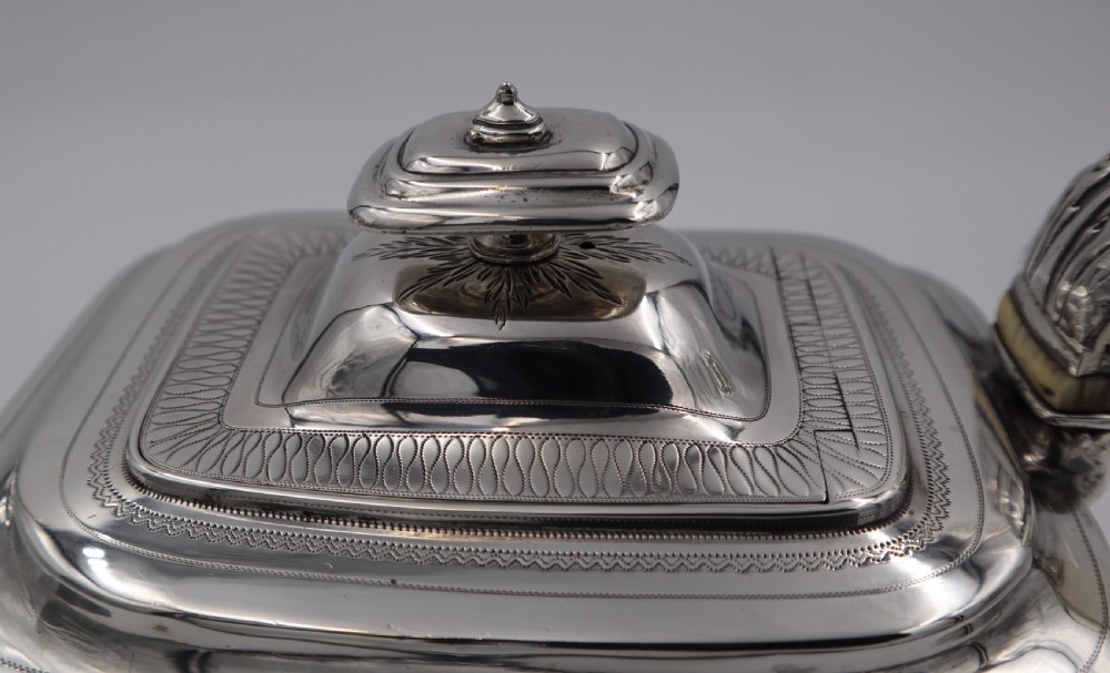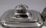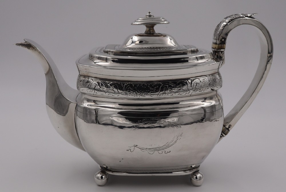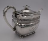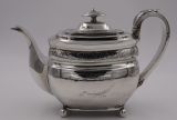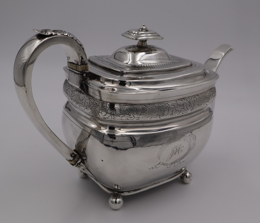Geo.III silver tea pot; of rectangular barge shape, resting on four ball feet. Decorated with a floral engraved band to the body and a monogrammed cartouche, this fine piece has a beautiful cast leaf handle. The Newcastle assay mark is always a big plus to collectors and this is a fine elegant example. Newcastle. 1808. Thomas Watson. Length (from tip of handle to tip of spout) 26cm Weight 18 troy oz/560gm Postage; by Royal Mail Special Delivery free of charge for deliveries within UK; outside UK deliveries by quotation. Payment; by using the payment button on this item's description, or bank transfer, please contact us for our bank details. All items are professionally packed prior to posting. Please do not hesitate to contact us for any information regarding any of our stock items, we try to make our descriptions as informative as possible, but are always delighted to be of any further assistance. Internal Ref: 28/1967