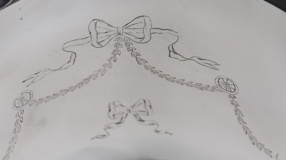 Lovely Edwardian silver fruit bowl; of circular form on a pedestal foot. The body is decorated with floral garlands and bows, Nice size, and a great display either with or without flowers.